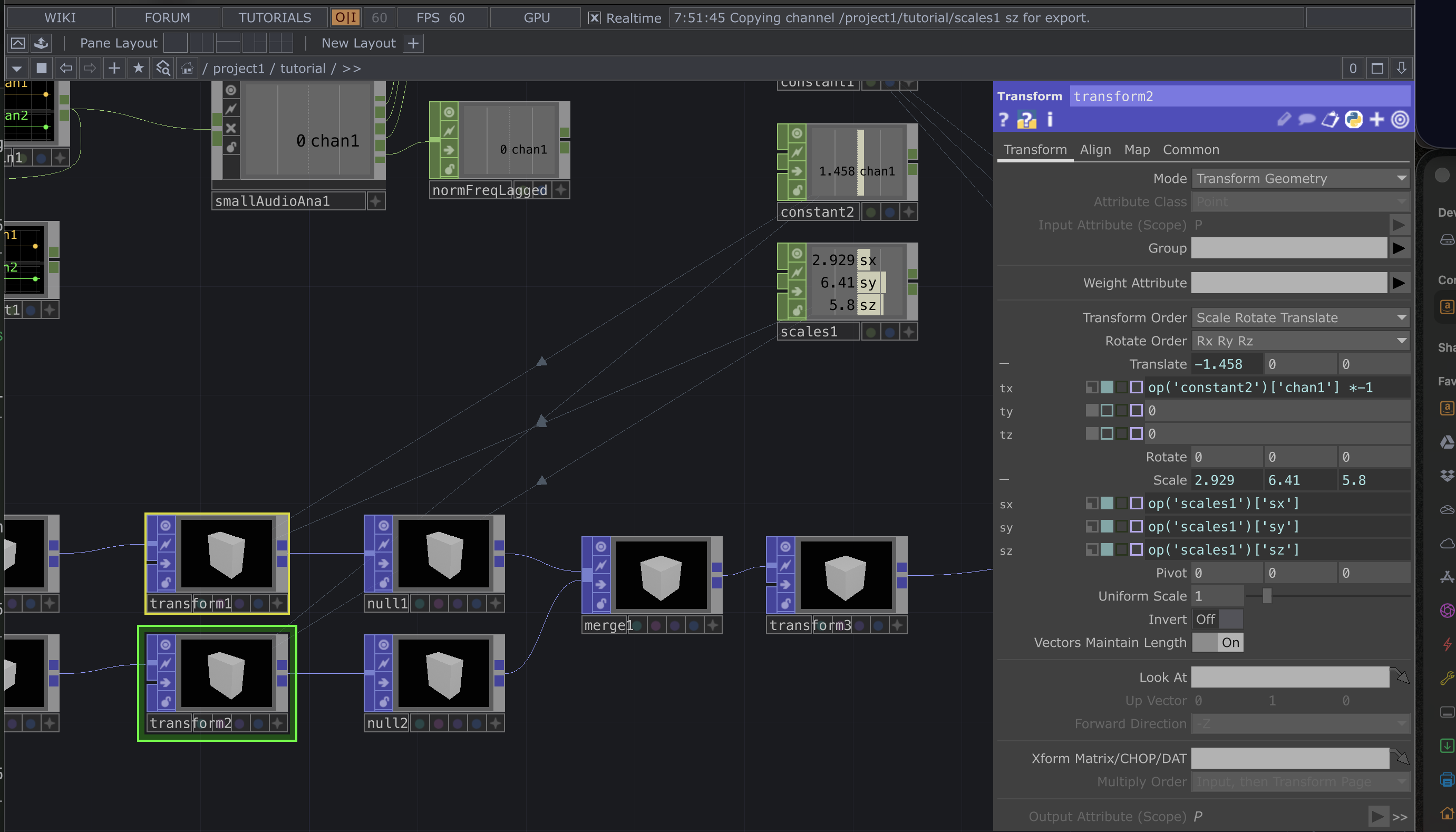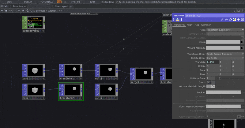 | Next we will use the scales1 CHOP and connect those to the scale values in both of the transforms POP nodes we just modified. |