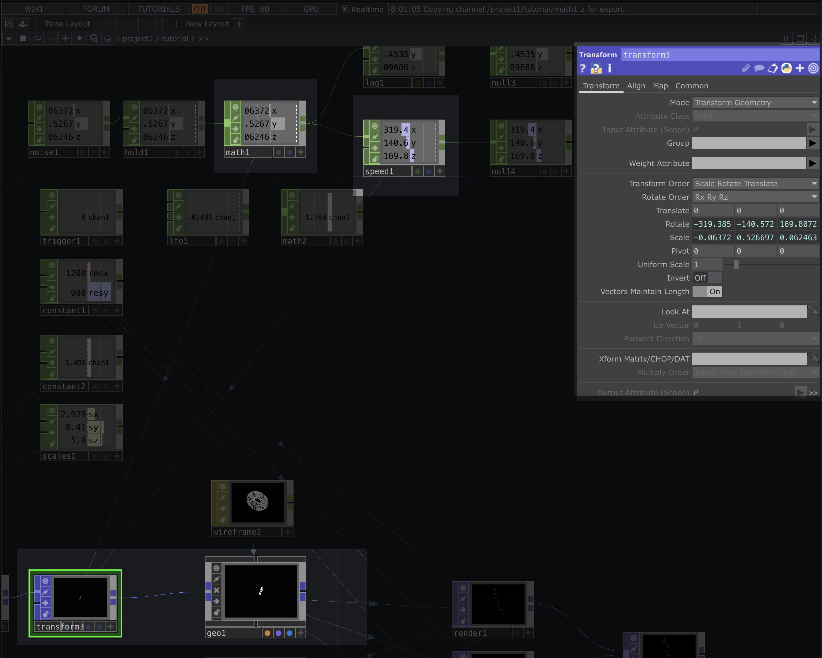 | On the last transform before going into the geometry node, we need to map the values from our speed and math CHOPs to the rotation and scale parameters respectivly |