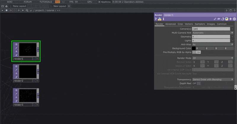 Now, navigate back to the render1 TOP and copy + paste it two times to create three total Render TOPs.