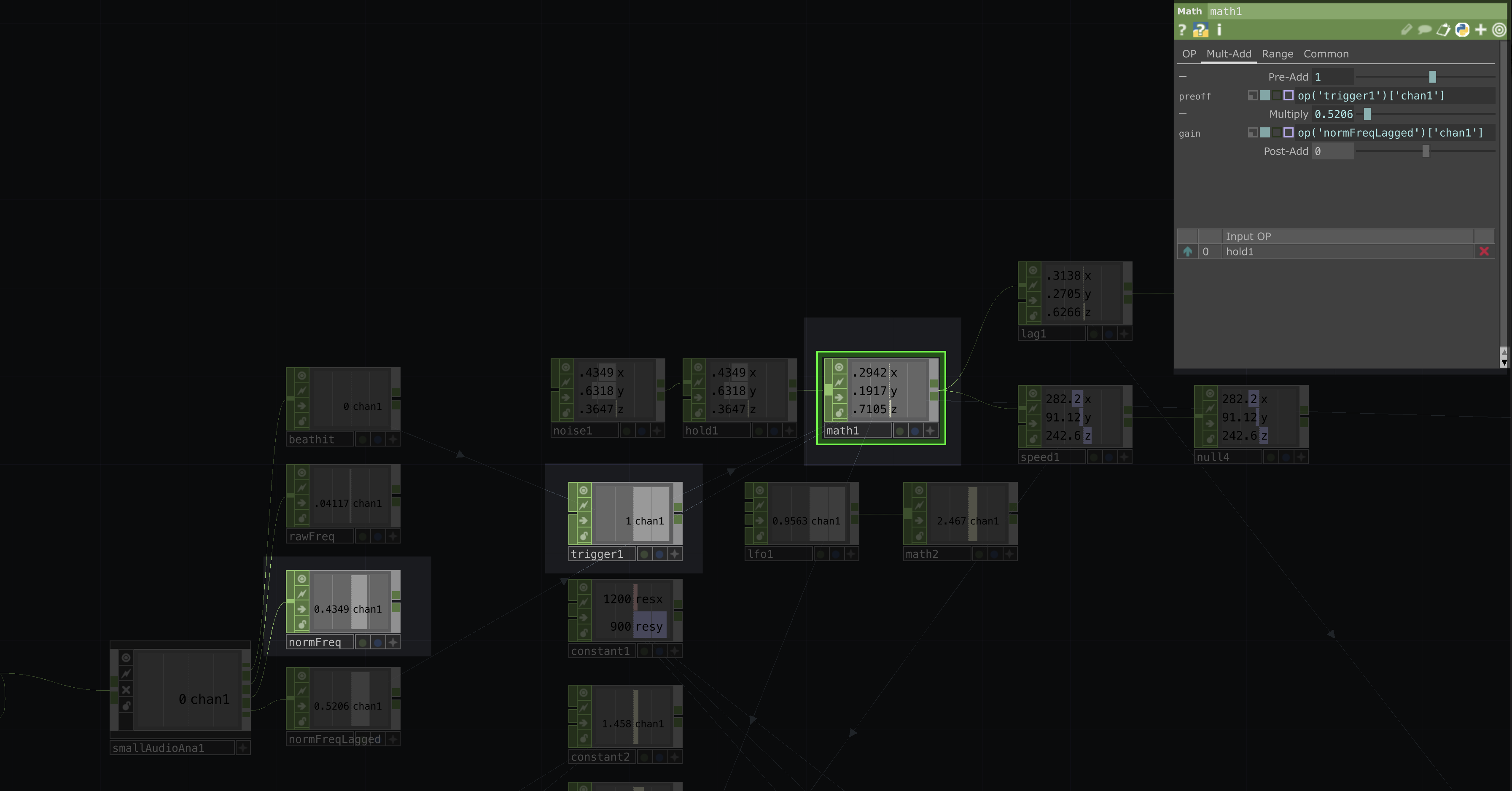 The math CHOP also needs to be hooked up the trigger and normFreqLagged * 200 in its Multi-Add section |