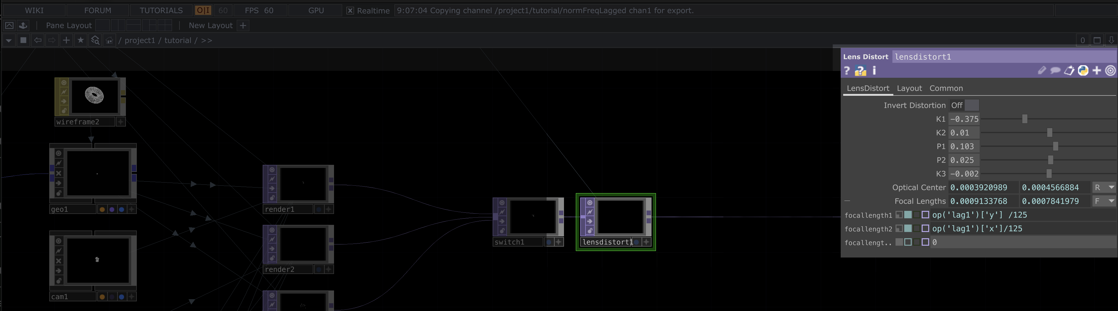 Now, add a Lens Distortion TOP between the Switch and Null TOPs. Once placed, connect it properly in the chain and adjust its parameters as shown in the reference images below.